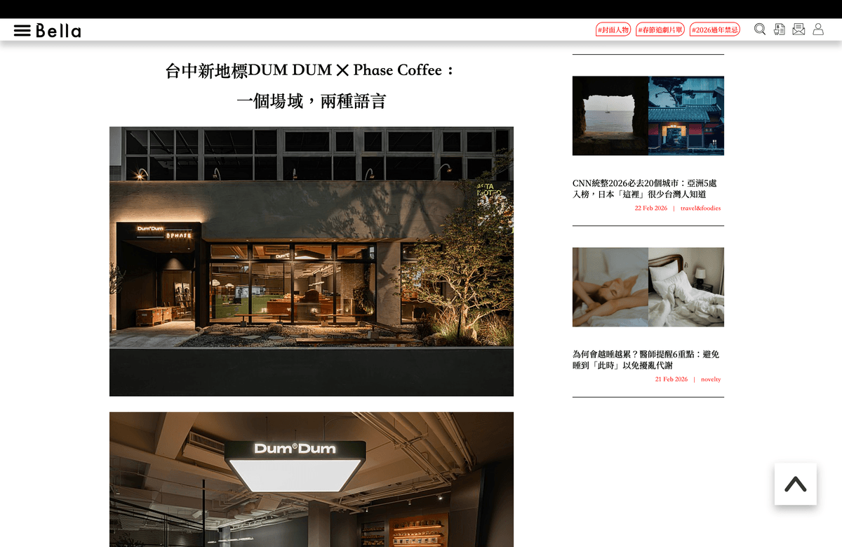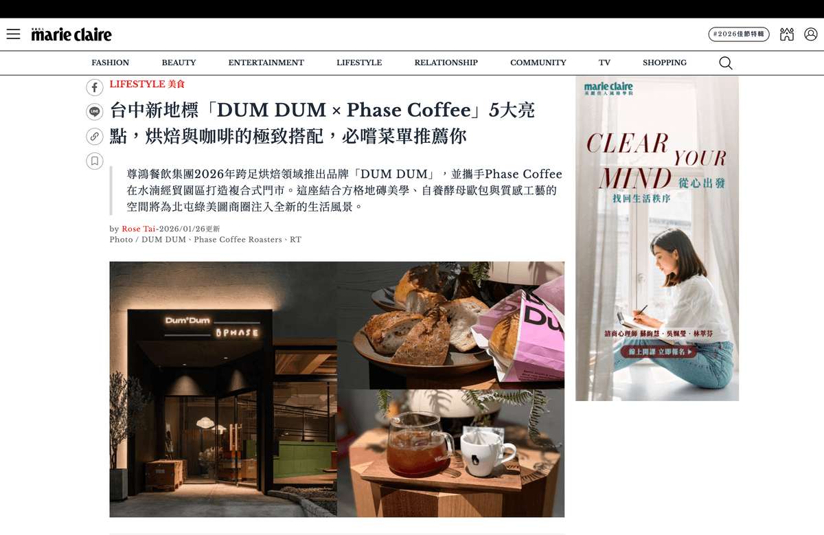 尊鴻餐飲集團於 2026 年正式跨足烘焙市場,推出全新品牌「DUM DUM」,並與台中精品咖啡品牌「Phase Coffee Roasters」攜手,於台中北屯鄰近綠美圖商圈開立全新門市。兩個風格鮮明、語言迥異的品牌在此交會,結合烘焙與咖啡的複合式場域,為水湳經貿園區注入嶄新的生活節奏。