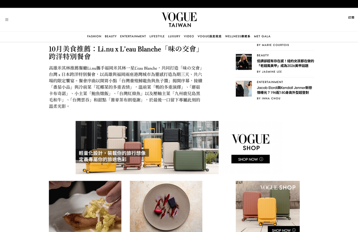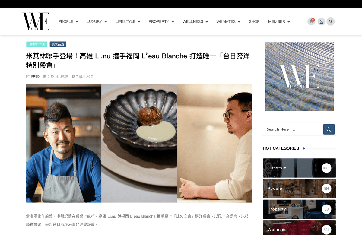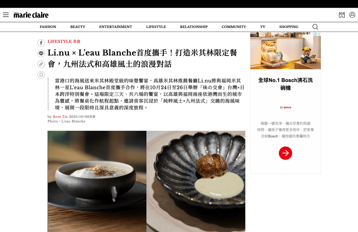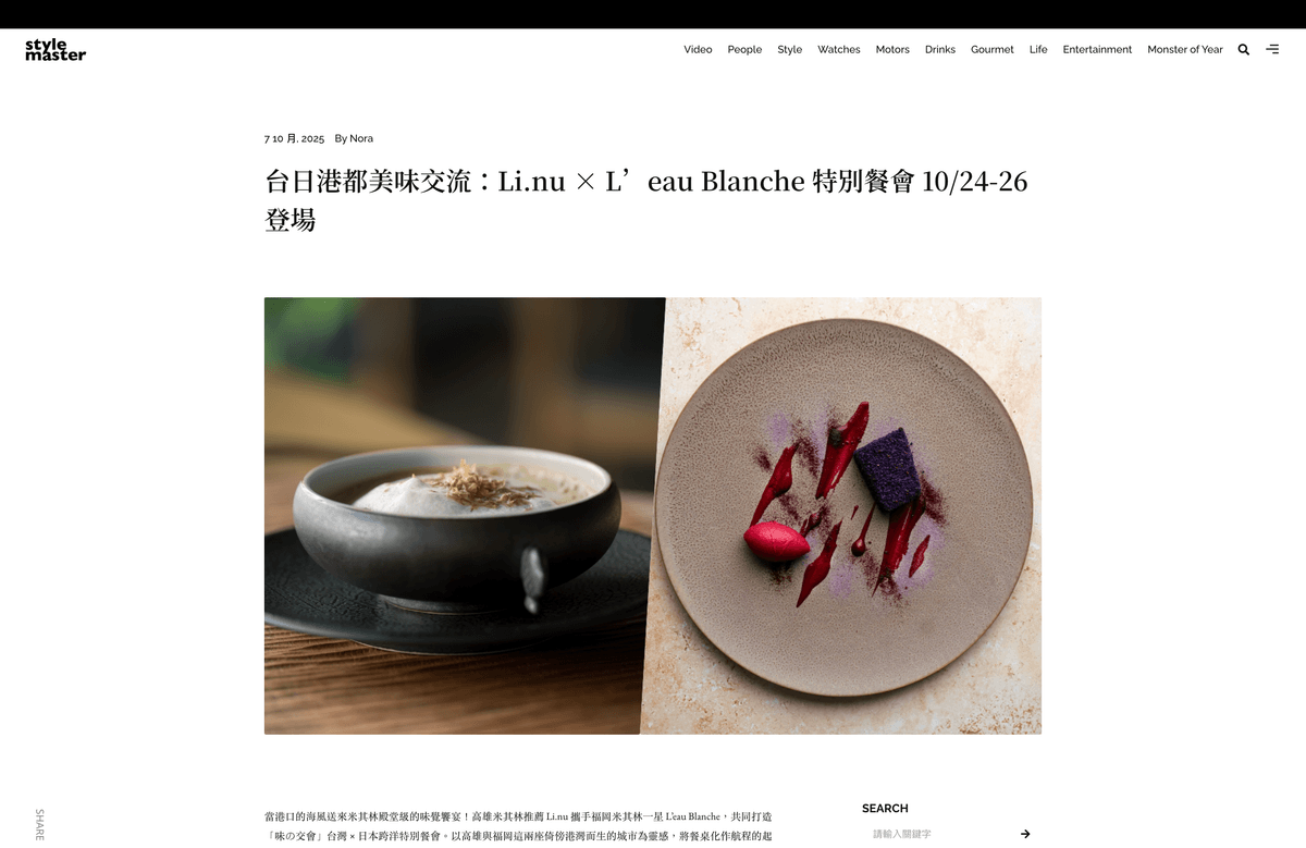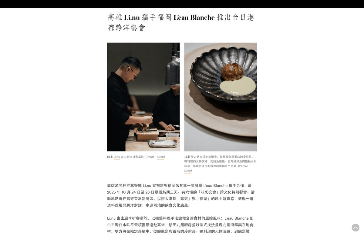 高雄米其林推薦 Li.nu 攜手福岡米其林一星 L’eau Blanche,共同打造「味の交會」台灣 × 日本跨洋特別餐會。以高雄與福岡這兩座倚傍港灣而生的城市為靈感,將餐桌化作航程的起點,邀請食客沉浸於「純粹風土 × 九州法式」交織出的海風味境。為期三天、共六場的限定餐會,在高雄亞洲新灣區鳴笛啟航,透過一道道料理的對話,串連兩大港都深厚的文化底蘊與海洋氣息。