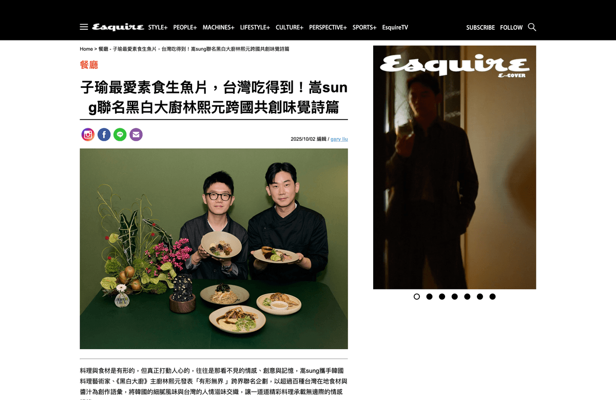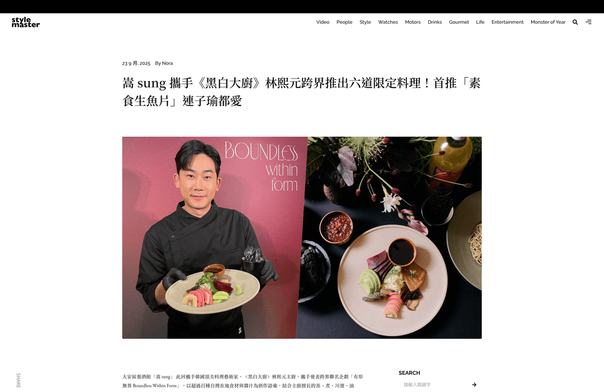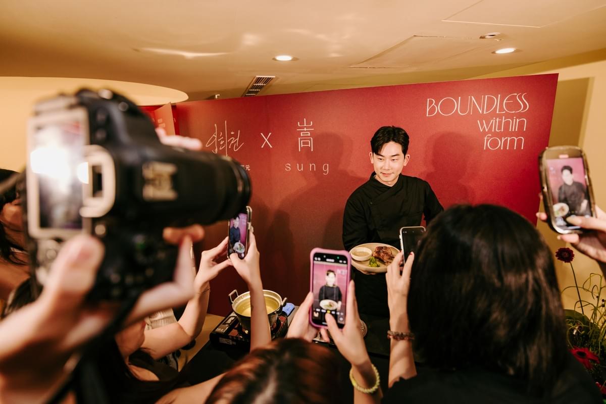 尊鴻餐飲集團旗下義式料理品牌 嵩 sung 攜手韓國頂尖料理藝術家、《黑白大廚》林熙元主廚,正式發表跨界聯名企劃——「有形無界 Boundless Within Form」。以超過百種台灣在地食材與醬汁為創作語彙,結合主廚擅長的蒸、煮、川燙、油炸、燉煮等工序,將韓國的細膩風味與台灣的人情滋味交織,化為一道道能被看見的料理、有邊界的器皿,卻承載無邊際的情感與創意。